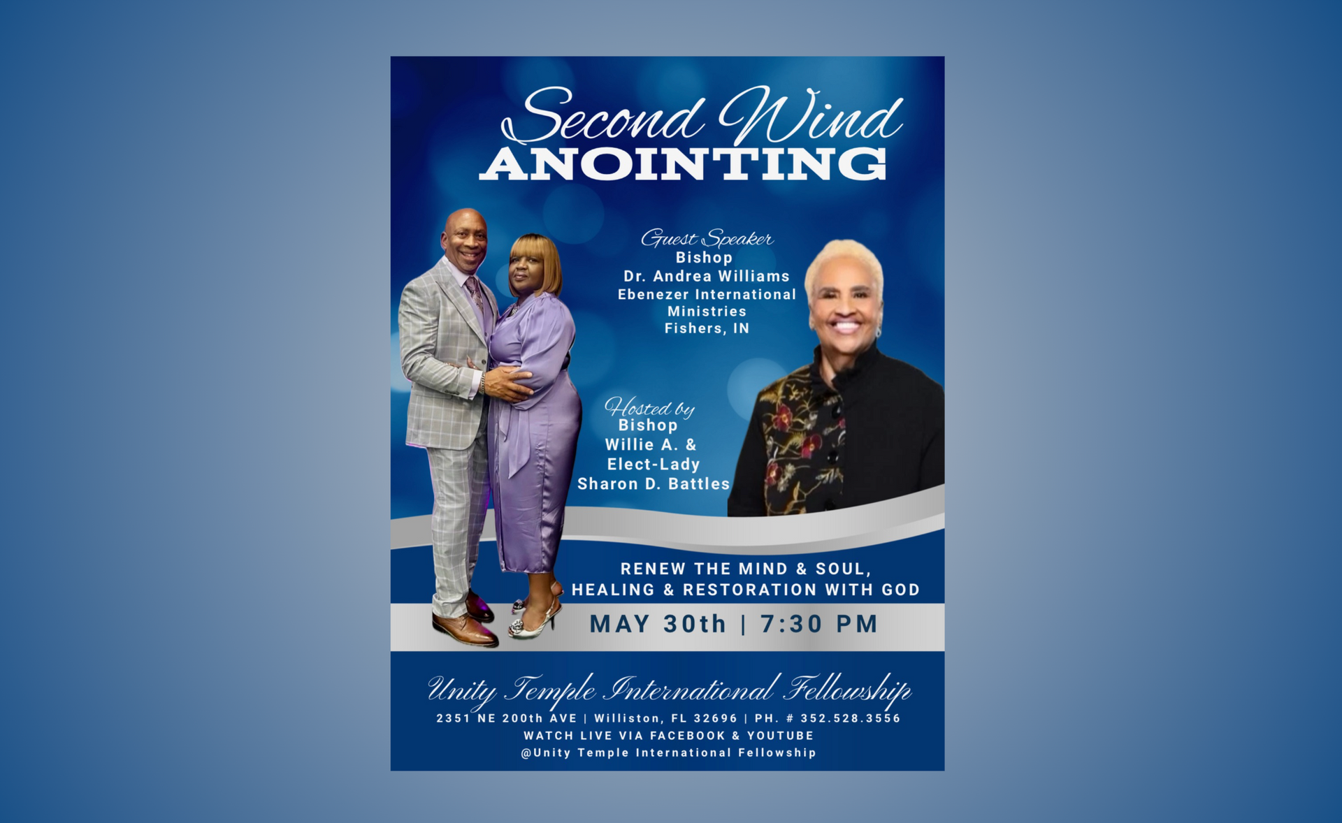 Bishop Dr. Andrea Williams will serve as the guest speaker at the Second Wind Anointing service hosted by Bishop Willie A. and Elect Lady Sharon D. Battles at Unity Temple International Fellowship in Williston, Florida.